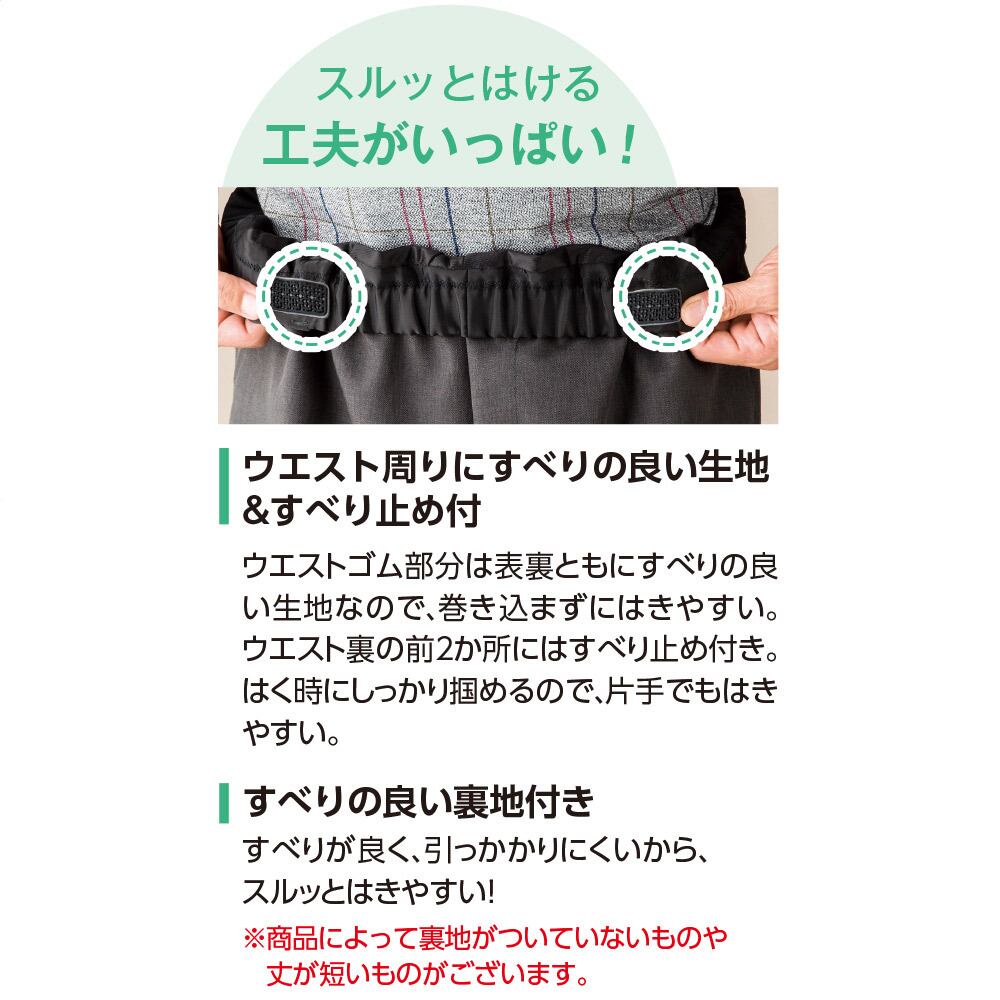 裏地:ポリエステル100%・ウエスト総ゴム・裏地付