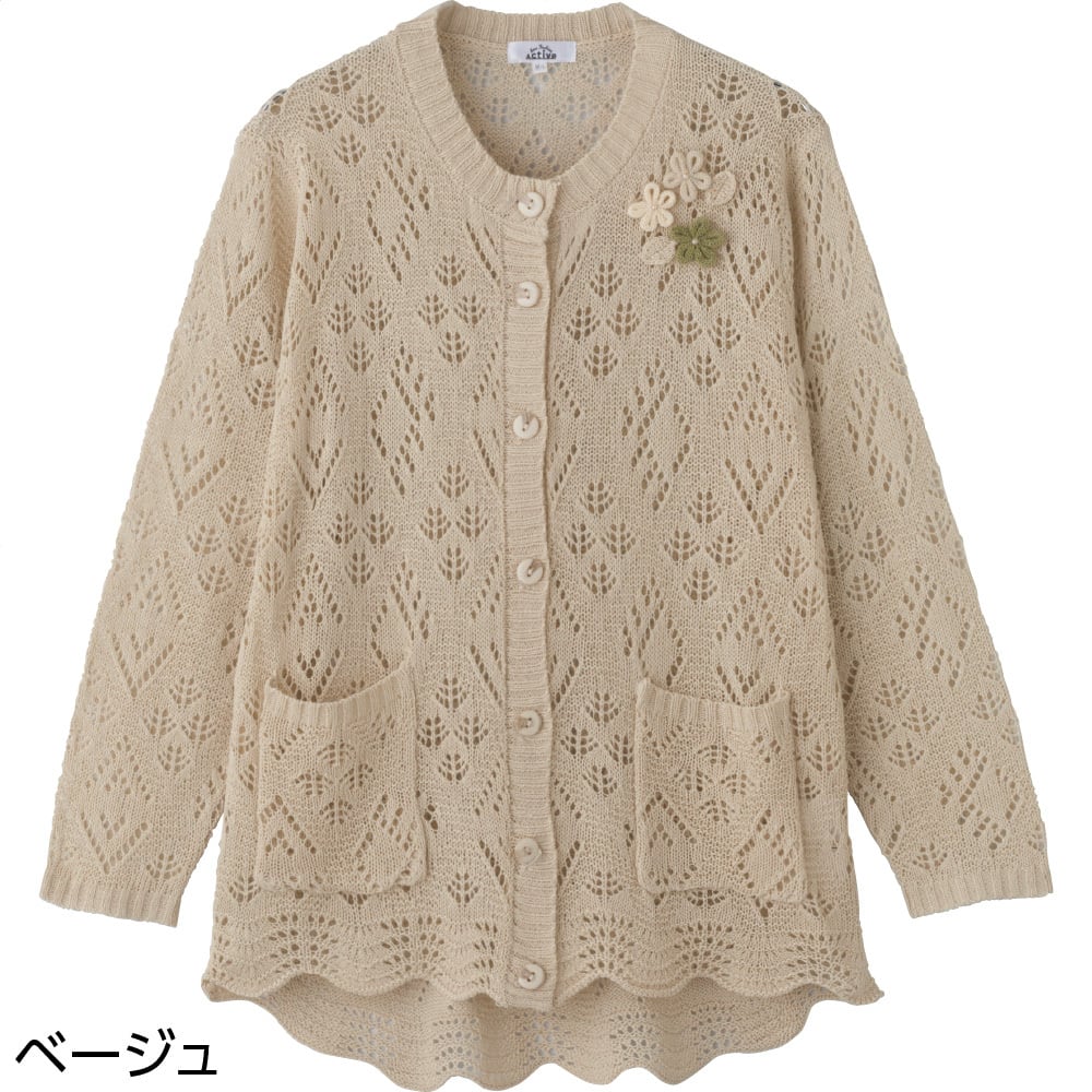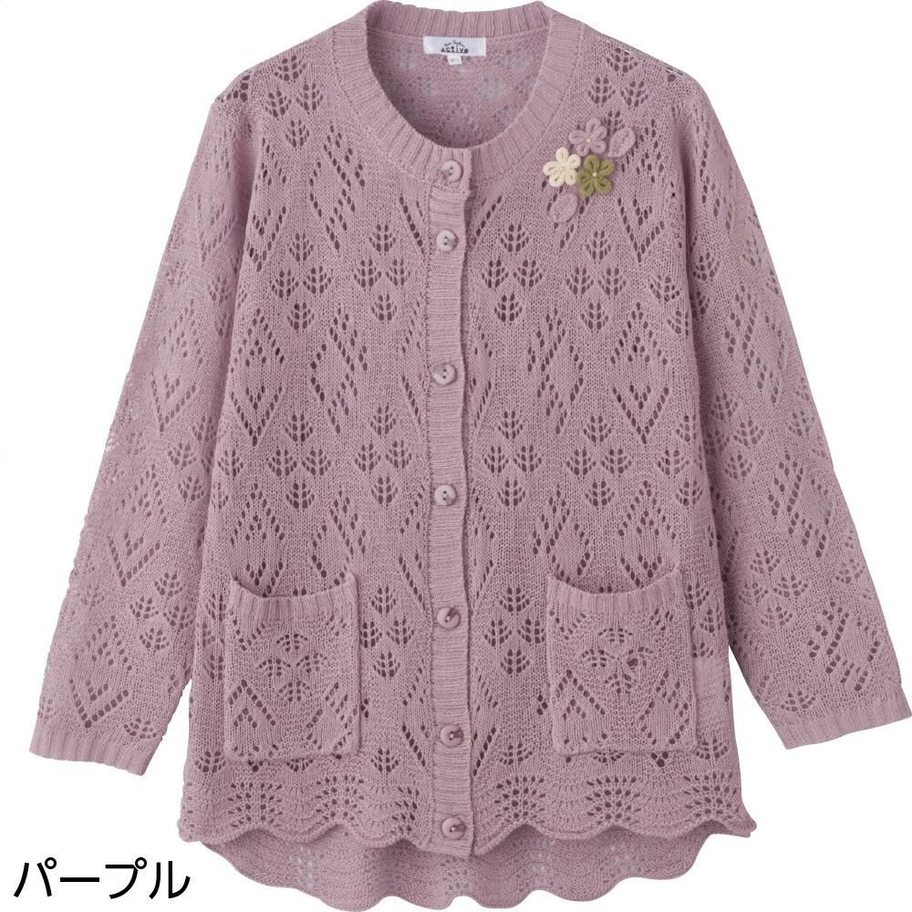 ニット斜め釦ホール丸首カーディ